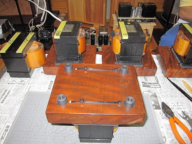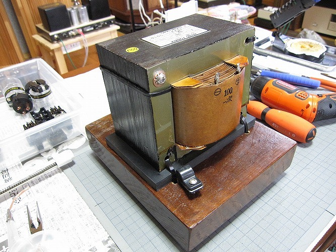 | トランスと板の間は硬いゴム板(10mm厚)にオーディオ用制振材を貼っています。 |