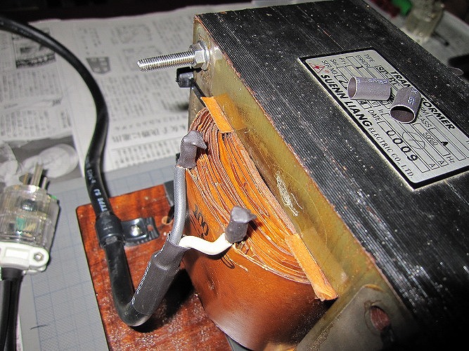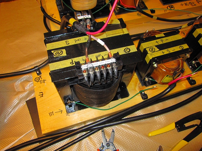 | C未使用のアイソレーショントランスが1台あるので、これも使用する。 ただ一次100V二次200Vなので、接続を逆にして使用します(禁断の技、笑) |