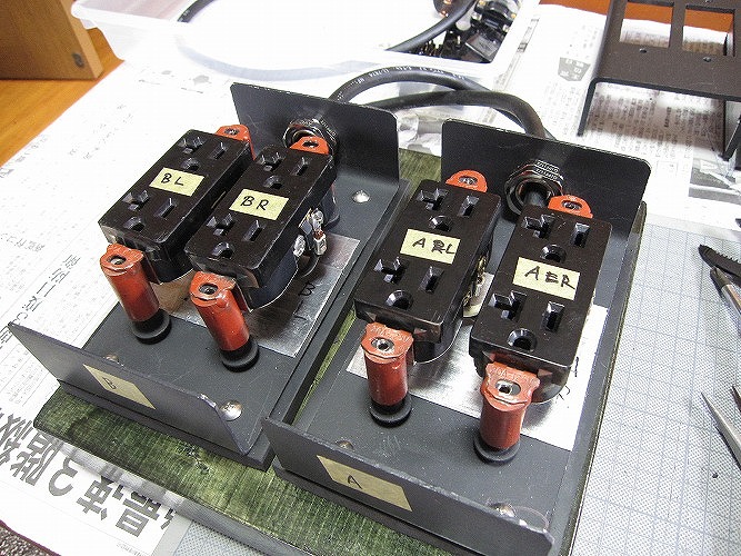 | オーディオ専用分電盤。 内部配線はツイストして短くが基本。配線に曲げのストレスをかけない |