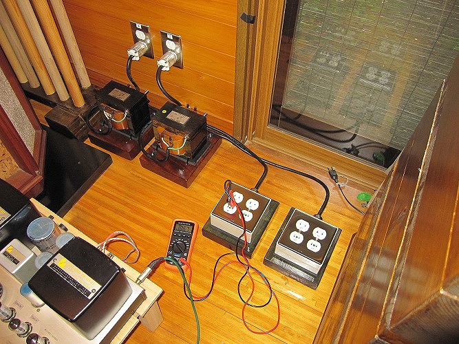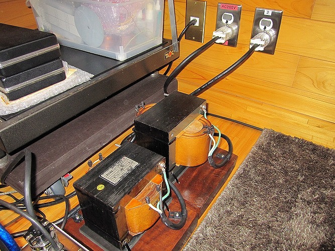 | ・オーディオ用電源は電灯盤から200V専用回路を2系統ひき(デジタル、アナログ)それぞれにアイソレーショントランス(絶縁トランス)で、100Vにして各機器に供給しています。 |