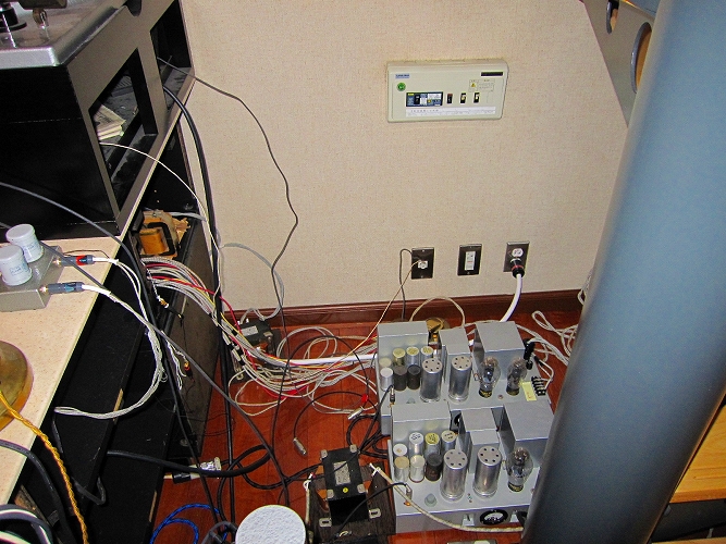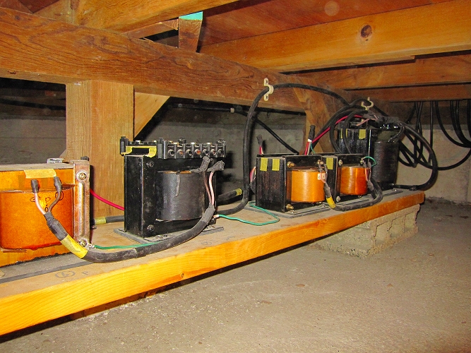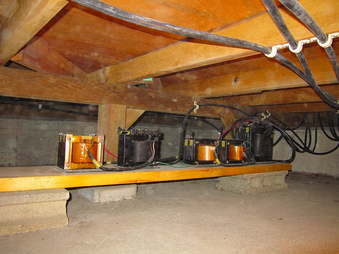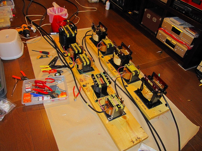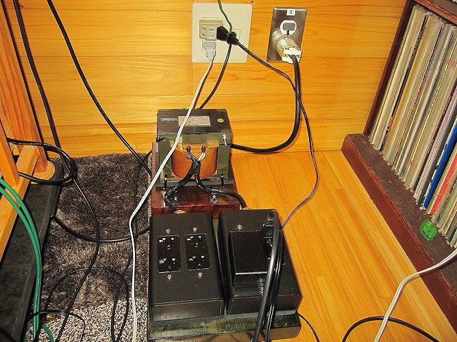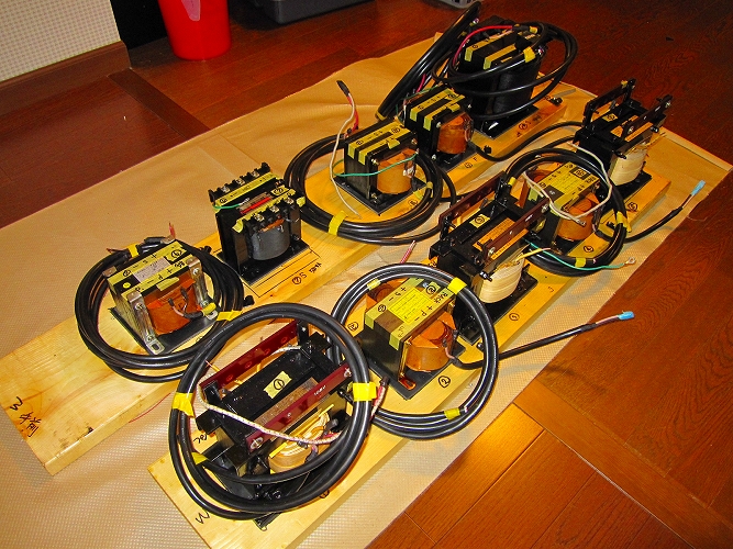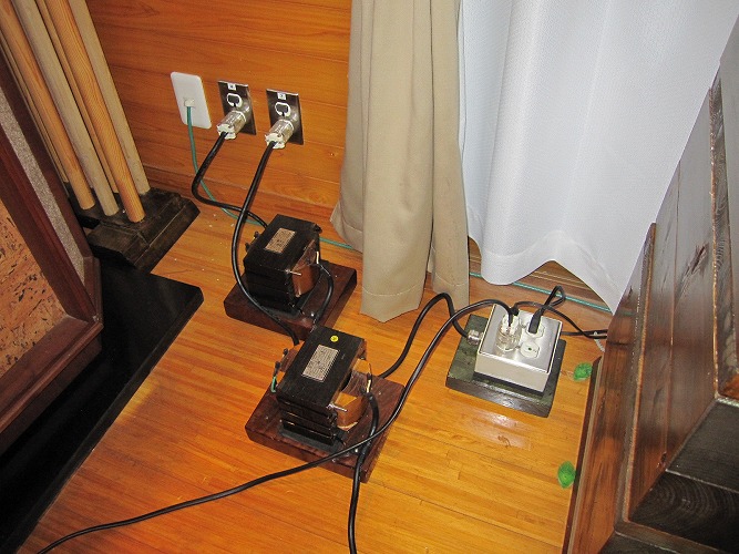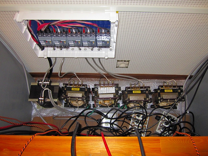 昨年6月からの電源改修工事が、ようやく全て完了しました。今までは、エナジーのアイソレーショントランス(100V)2台を取りあえず、仮接続して利用していましたが、今回ようやく、200Vトランス(200V→100V)1台と4台の100V(100V→100V)アイソレーショントランスが接続され、全てのオーディオ用電源が5台のアイソレーショントランス経由で使用できるようになりました。