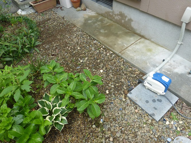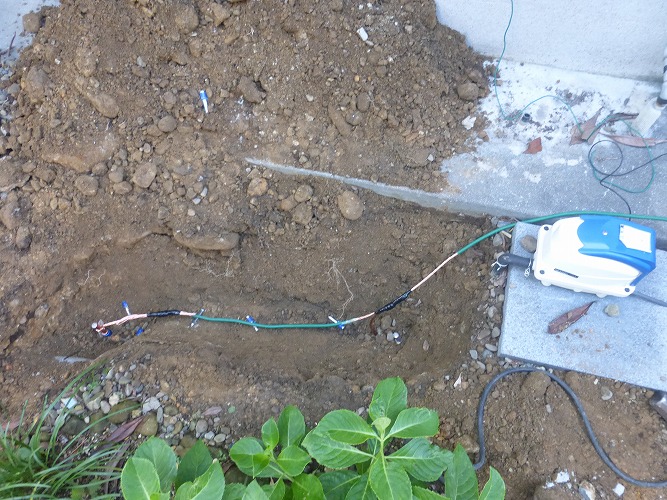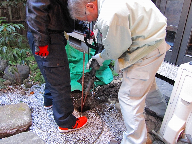9月に地元電気工事店が施工、 連結アース棒1.5mx2本と1.5mx3本を2箇所打設。打設には「コンクリートはつり機」を使います。 たった5本で接地抵抗値はなんと、6.7Ωという驚異的な低い値!