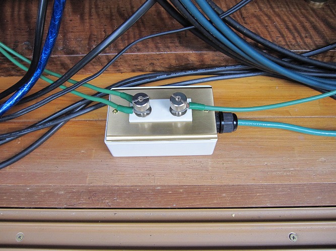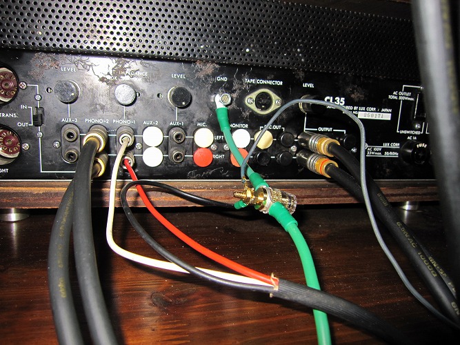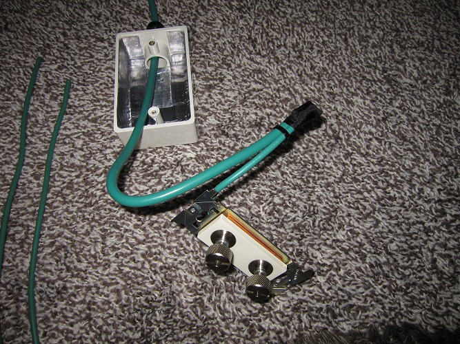 下側の緑の線はオーディオラック横壁から取り出し、オーディオ機器用アース線です。線の圧着端子は電気工事で使うものでなくオーディオ用で、銅端子を銀メッキしてその上に銅メッキをした特製品です。圧着してアセテートテープで絶縁します。