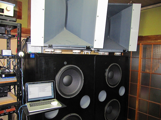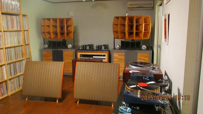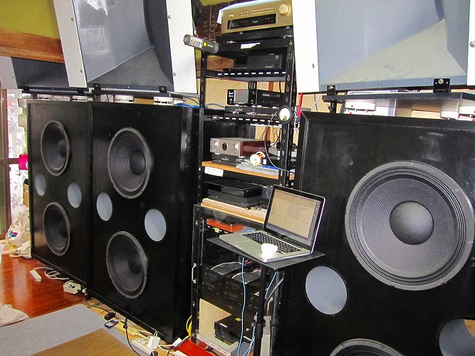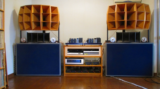 | エレクトロボイスの46Cmウーファを片チャンネル4発、左右合計で8発、その上に同じエレクトロボイスのホーンを片チャンネル2個、計4個使った2WAYの大掛かりなシステムです。ウーファ用エンクロージャーは1個あたり760リットルこれが4個並んでいて圧巻です。締まりの良い低音を再生します。 |