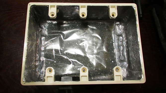 樹脂製ボックスに制振材(鉛テープ)を貼って組み込みます。