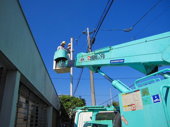 | 地元都城、飯山電業の皆さんもこんな工事は初めての経験で、熱心に見ておられました。 |