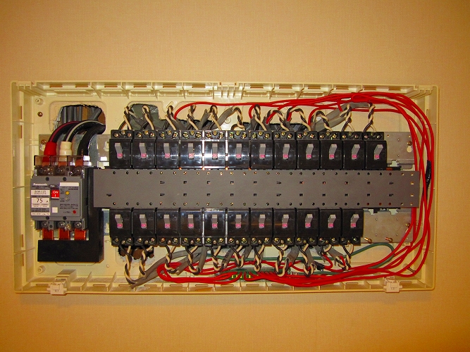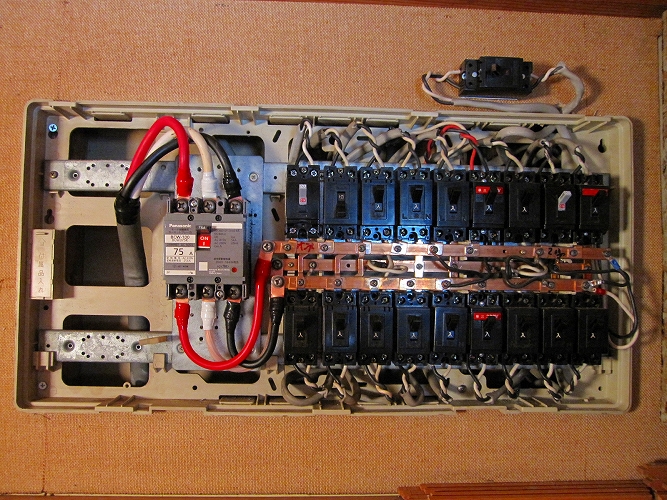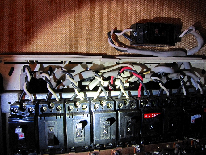 | 改修前の主分電盤 生活用電源とオーディオ用電源とが供用となっています。通常はこれが一般的。 |