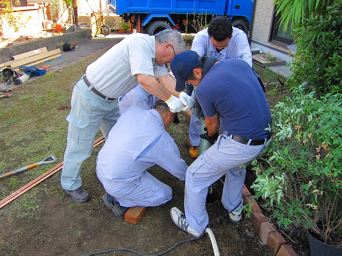 | 5人がかりでアース棒を打ち込みます。 |