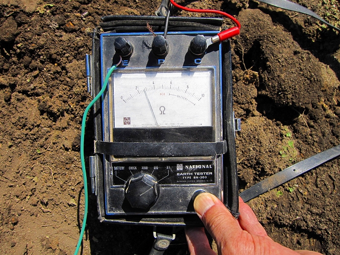 前回実施したアース敷設工事で14Φ×1.5メートルのアース棒を28本使用して、アース抵抗は8.6オームとなっています。