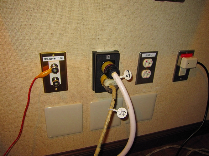 | ・専用回路といえ、電灯盤の分岐ブレーカーからですのでノイズの影響はあります。アースはオーディオ用単独で、連結接地棒を打ち込みして接地抵抗値は87Ωです。 |